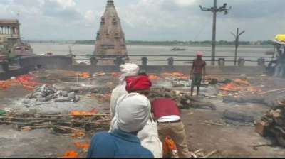 तेज बारिश के चलते मणिकर्णिका घाट डूबा, छत पर हो रहे अंतिम संस्कार