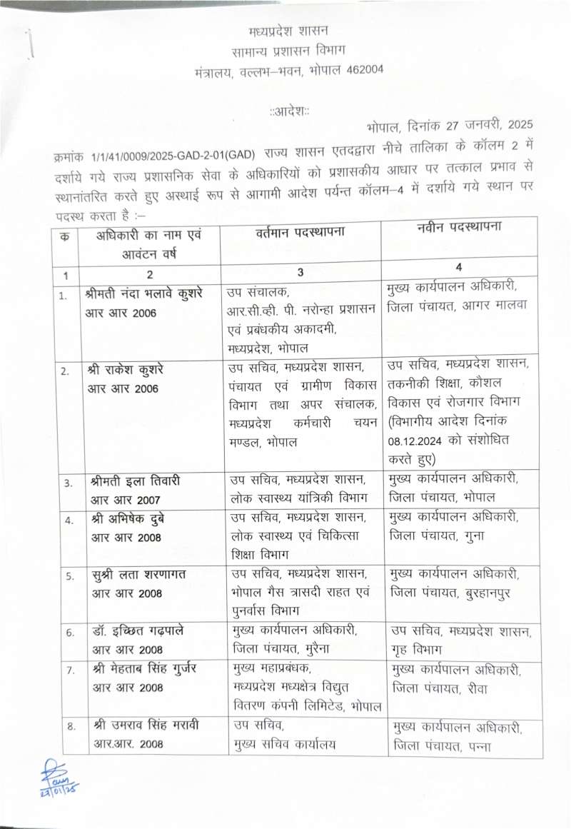 मुख्यमंत्री के सचिव भरत यादव को मध्य प्रदेश सड़क विकास निगम का प्रबंध संचालक बनाया गया है, जबकि उनके स्थान पर सीबी चक्रवर्ती एम को मुख्यमंत्री डॉ. मोहन यादव का सचिव बनाया गया है। इसी तरह आईएएस अधिकारी ललित कुमार को राजस्व मंडल ग्वालियर का सदस्य, अविनाश लवानिया को मध्य प्रदेश पावर मैनेजमेंट कंपनी लिमिटेड जबलपुर का प्रबंध संचालक, वंदना वेद को आदिम जाति क्षेत्र विकास योजना का संचालक, सत्येंद्र सिंह को एमपी स्टेट कोऑपरेटिव डेयरी फेडरेशन लिमिटेड का प्रबंध संचालक, मनीष सिंह को जेल और मध्य प्रदेश परिवहन विभाग का सचिव बनाया गया है। इसी तरह कलेक्टर खरगोन कर्मवीर शर्मा को आयुक्त सह संचालक खाद्य नागरिक आपूर्ति निगम की जिम्मेदारी दी गई है।